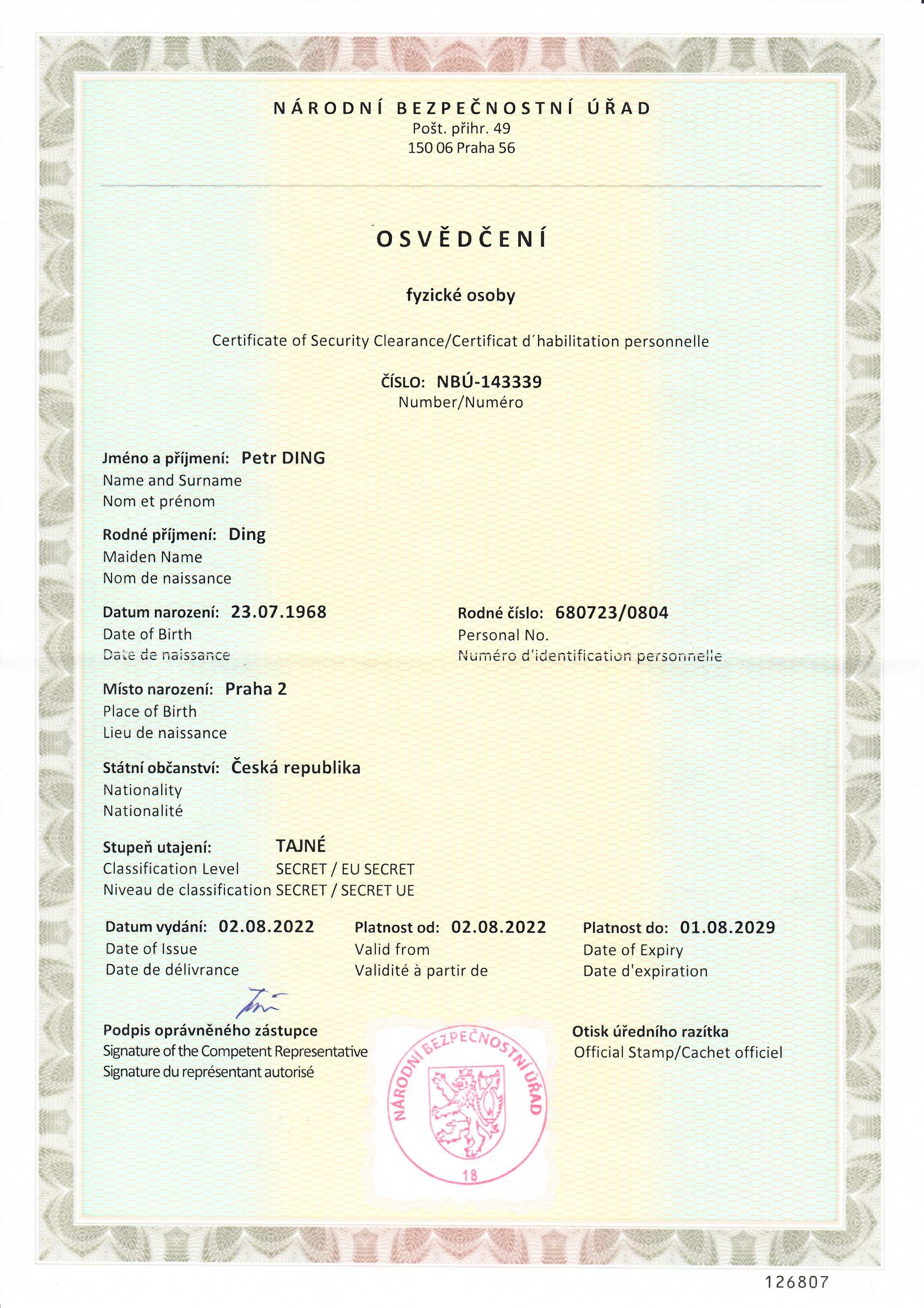 | Cetrtificate of Security Clearance - Secret (NBU 143339) | Národní Bezpečnostní Úřad |